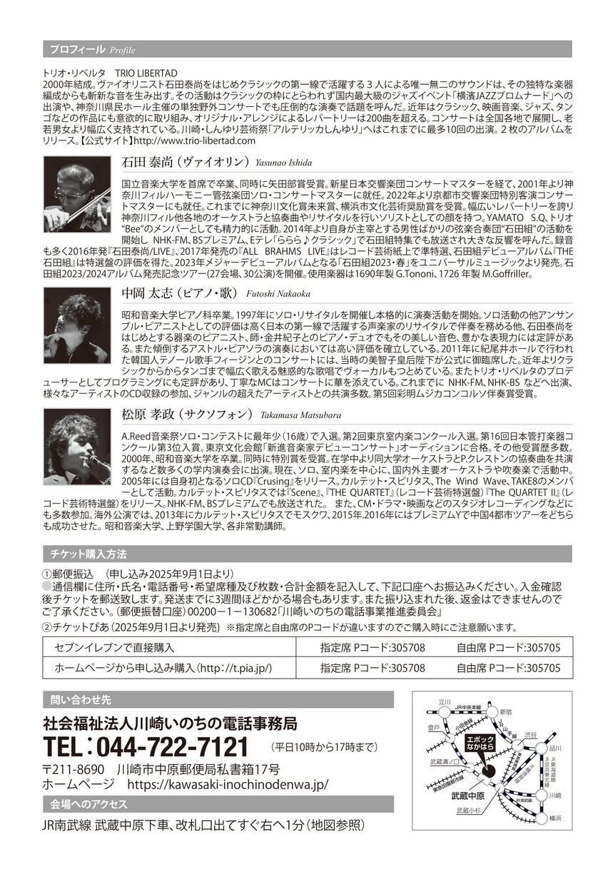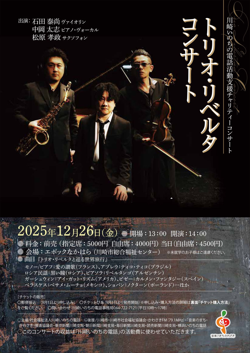 ●2025年12月26日(金) ●「トリオ・リベルタ コンサート」 ●会場:エポックなかはら(川崎市総合福祉センター) ●出演: 石田康尚(ヴァイオリン) 中岡太志(ピアノ・ヴォーカル) 松原孝政(サクソフォン) ●開場:13:00 ●開演:14:00 ●料金:前売り(指定席 5,000円、自由席 4,000円)、 当日券(自由席 4,500円) ※未就学のお子様はご遠慮ください。 次のチケット購入方法からお選びください。 ① 郵便振込(申込9月1日より) 通信欄に 住所/氏名/電話番号/希望枚数/指定席(5,000円) または自由席(4,000円)か/合計金額 以上を記入して、 郵便振替口座 00200-1-130682 「川崎いのちの電話事業推進委員会」 にお振込みください。 指定席を複数枚購入の際は並び席をお取りしますが、 ご希望に添えない場合はご了承ください。 入金確認後チケットを郵送します。 発送まで3週間ほど時間がかかる場合もあります。 ② チケットぴあ(9月1日発売開始) 指定席か自由席を選択ください。 指定席(5,000円)はこちらをクリック(ぴあサイト) 自由席(4,000円)はこちらをクリック(ぴあサイト) ・セブンイレブンで直接購入 ※指定席と自由席のPコードが違いますのでご購入時にご注意ください。 指定席(5,000円) Pコード:305708 自由席(4,000円) Pコード:305705 コンサートの収益は「川崎いのちの電話」の 活動費に使わせていただきます。 |